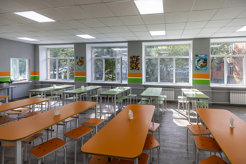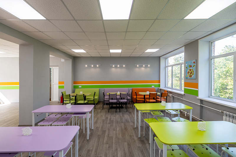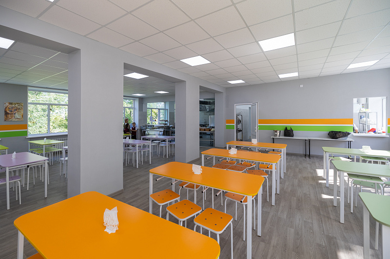 Подрядной организацией в сжатые сроки были проведены работы по отделке помещений: уложена новая плитка, выполнена покраска стен, полностью обновлены зоны приготовления пищи и обеденный зал. Кроме того, в рамках программы модернизации школа получила новую мебель для столовой.