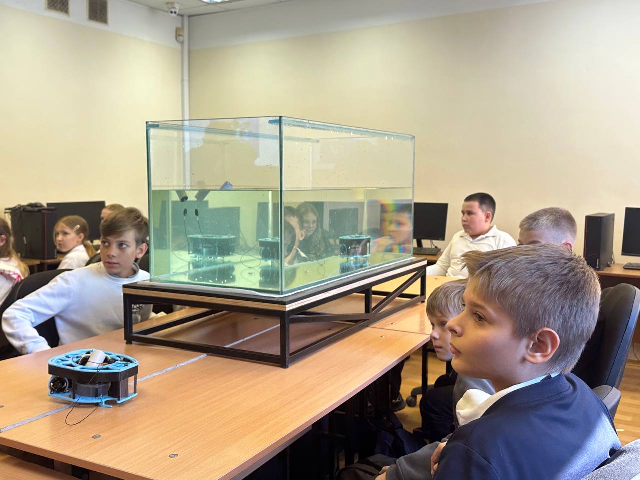 Урок закончился, и дети обсуждали увиденное, задавали вопросы и делились впечатлениями о работе подводного робота, осознавая, как техника применяется в реальном мире.