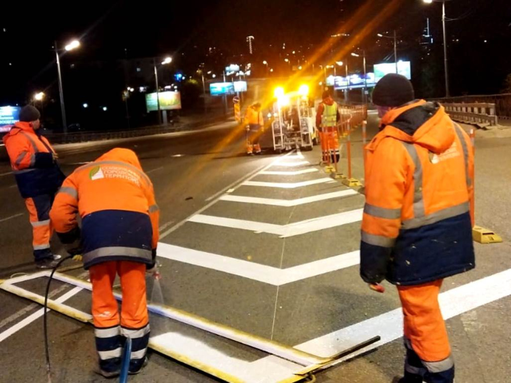Специалисты проводят работы по нанесению разметки и указателей ночью, просят водителей быть внимательными и осторожными.