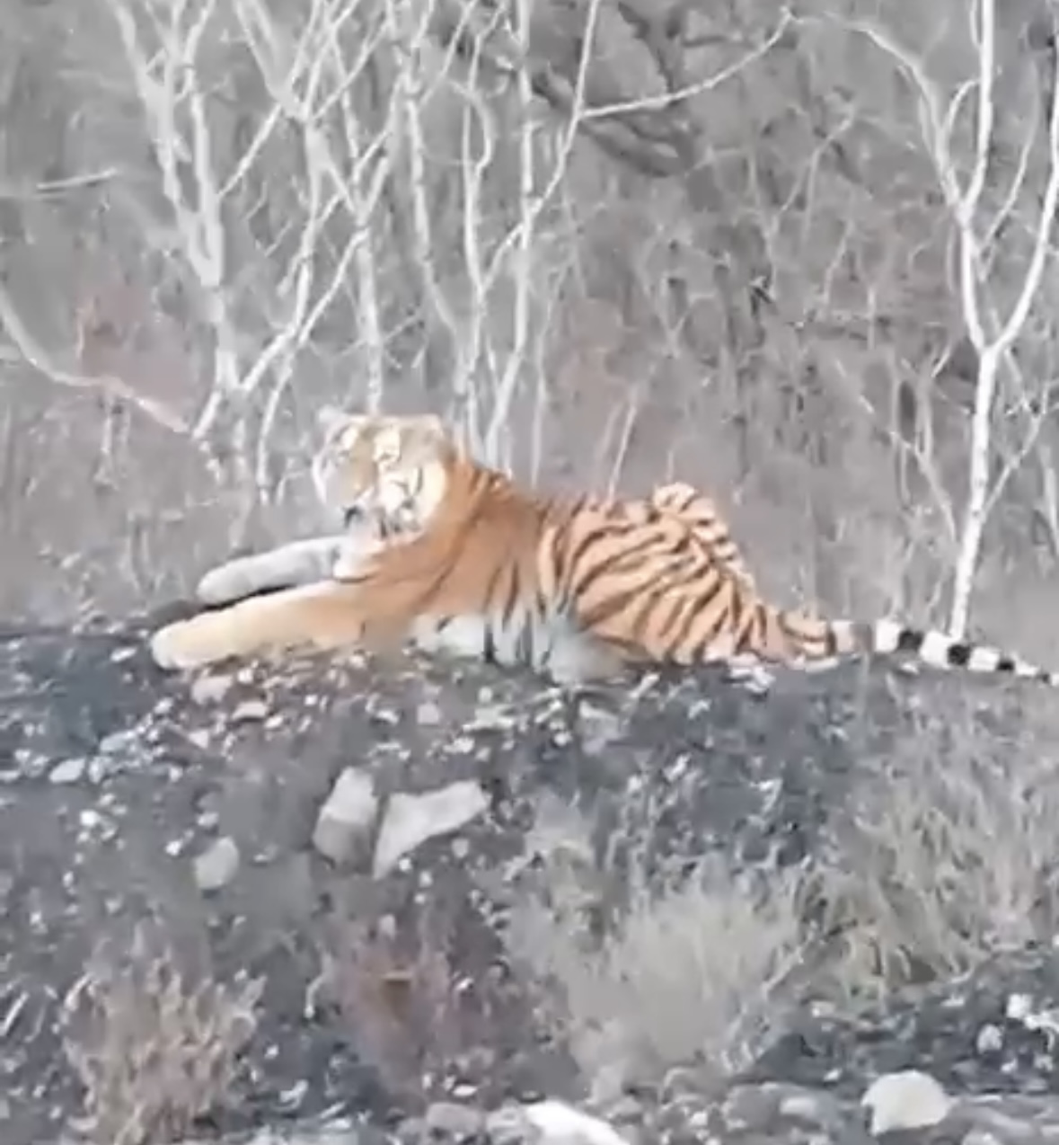 Хищник, который, по информации тг-канала vlnews25, не боится людей и машин, отдыхал неподалеку от населенных пунктов Фокино и Дунай. Заметив, что его снимают на видео, тигр зевнул, обнажив свои клыки.