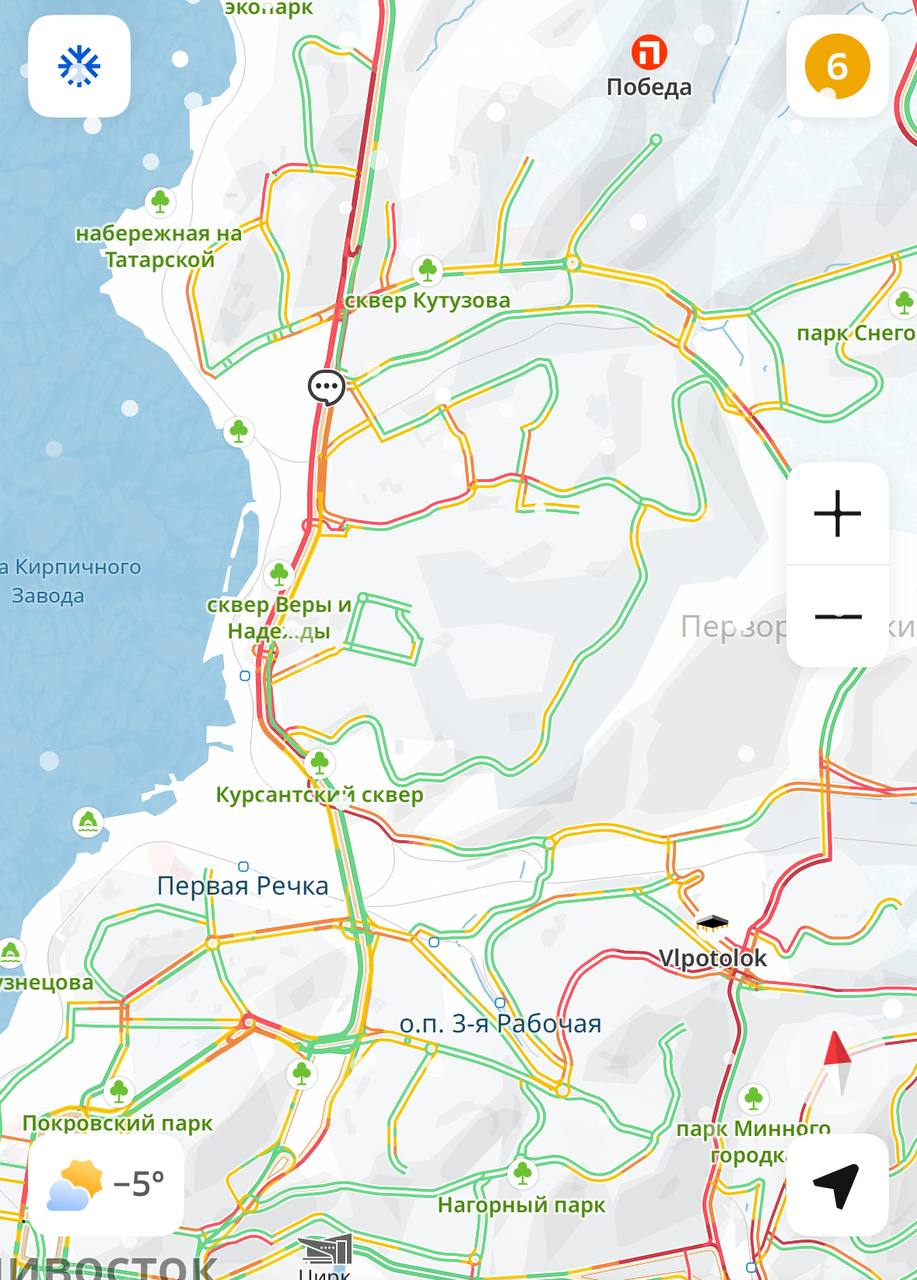 После снегопада дорожная ситуация во Владивостоке достигла критического уровня: сервисы оценивают загруженность в 6-9 баллов. Как сообщает РИА VladNews со ссылкой на данные городских навигационных сервисов 2ГИС и Яндекс.Карты.