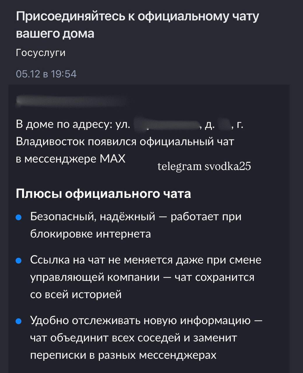 Жителям Владивостока и других населённых пунктов Приморья массово начали приходить уведомления на портале «Госуслуги» о создании отдельных чатов для каждого дома. Сообщает РИА VladNews со ссылкой на Svodka25— речь идёт об официальных домовых чатах.