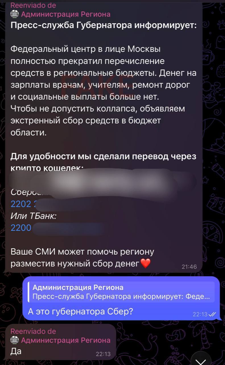 Сообщения рассылаются от имени «пресс-службы губернатора» и содержат утверждения о прекращении федерального финансирования. Для «спасения края» злоумышленники предлагают переводить средства на банковские карты и криптокошелёк, при этом на уточняющие вопросы заявляют, что карта якобы принадлежит губернатору.
